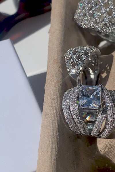Make a luminous statement with this radiant-cut solitaire silver plated ring, where brilliance meets elegance. The crisscross band design is encrusted with pavé-set crystals, highlighting the central, dazzling rectangular stone. Perfect for formal events or engagement-style looks, this silver plated piece adds an opulent touch to any outfit while remaining timeless in appeal.